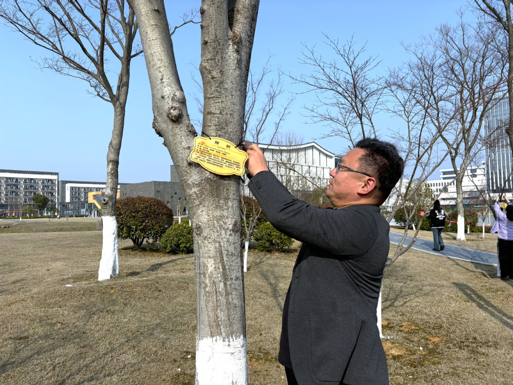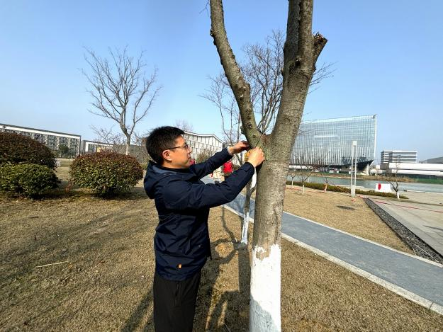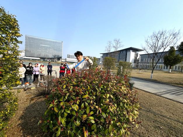 在组织委员孙祖霞的带领下,大家了解了校园绿化资源的分布概况以及春季赏花的小贴士。园艺师傅演示了园艺剪和草坪机的操作方法后,大家跃跃欲试,踊跃参与了绿篱的修剪,体验了劳动的快乐。随后,党员们又集体出动,为树木悬挂树牌,并参与了拔草活动,大家互相协助,用自己的劳动诠释着对大自然生命的关爱,在劳动中感受着校园的盈盈春意。